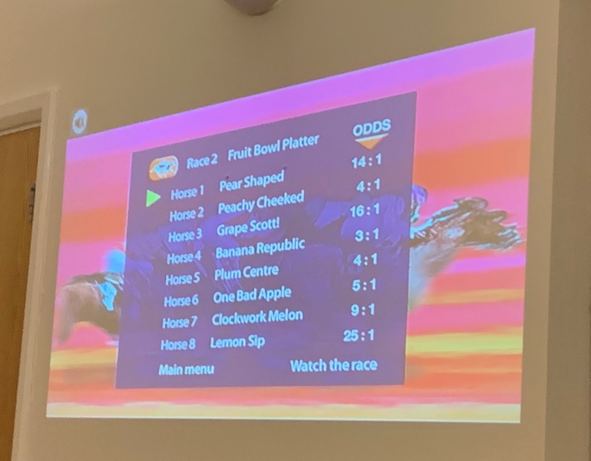 There were 8 races and each race had 8 runners. At the start of each race the list of runners and each horse’s racing odds was shown, from which we all had to make educated guesses who would come first, second or third. Points were awarded as follows for placing the horses in the correct order, 1st – 3 points, 2nd – 2 points and 3rd – 1 point.